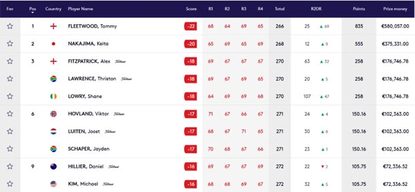 汤米·弗利特伍德本轮火力全开,开局现在1号洞抓鸟,但紧接着在2号洞失误吞入柏忌,接着在4号洞推入5码鸟推,并且在上半程最后阶段抓住机会,在7-9号洞连抓3鸟;转场后,这位英格兰选手先又在10号洞抓鸟,随后在14号洞推入4码鸟推,在17号洞打进7码小鸟球,最后拿到了-7杆的成绩,总成绩-22杆登顶领先榜,拿到自己的第七个DP World巡回赛冠军。