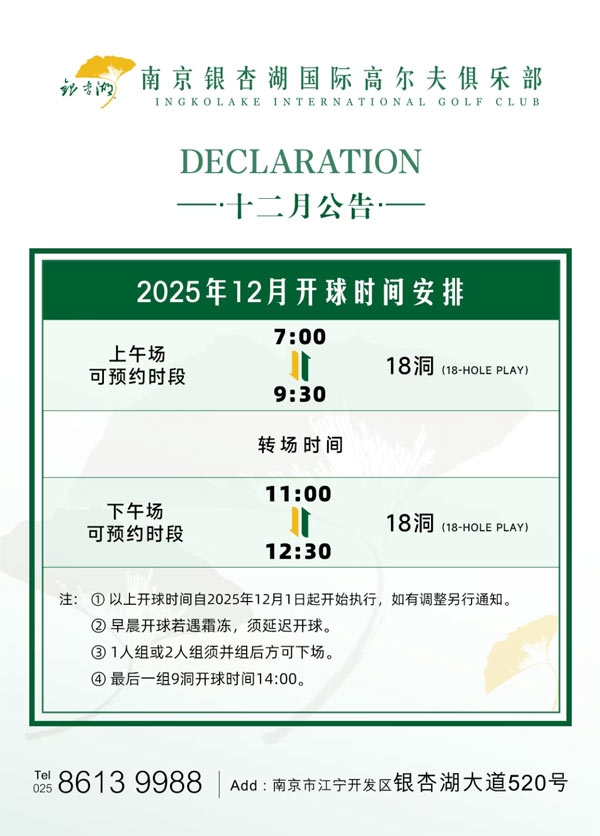 摘要:【银杏湖·公告】十二月Tee-time时间安排!
