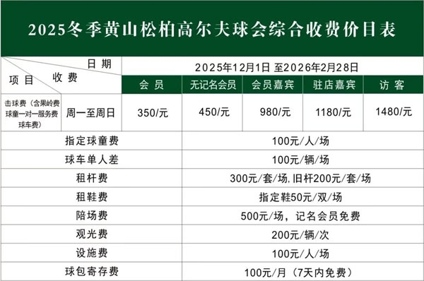 2025冬季黄山松柏高尔夫球会综合收费价目表