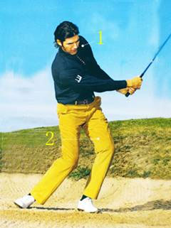 握球杆的是你的双手,但使杆头穿过沙子的动力来自于肩部。冲击球过程中,应使前侧肩部向着目标左侧转动。大多数球手在此时只是抬高了左肩,这种动作会使得杆头深深地陷进沙中。