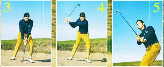 沙坑球的上杆很简单:手腕上翘,带动球杆上移。上杆时,左腕始终是上翘的。当双手与髋部同高时,你应该能够看到左手拇指根部的手腕处出现皱褶。