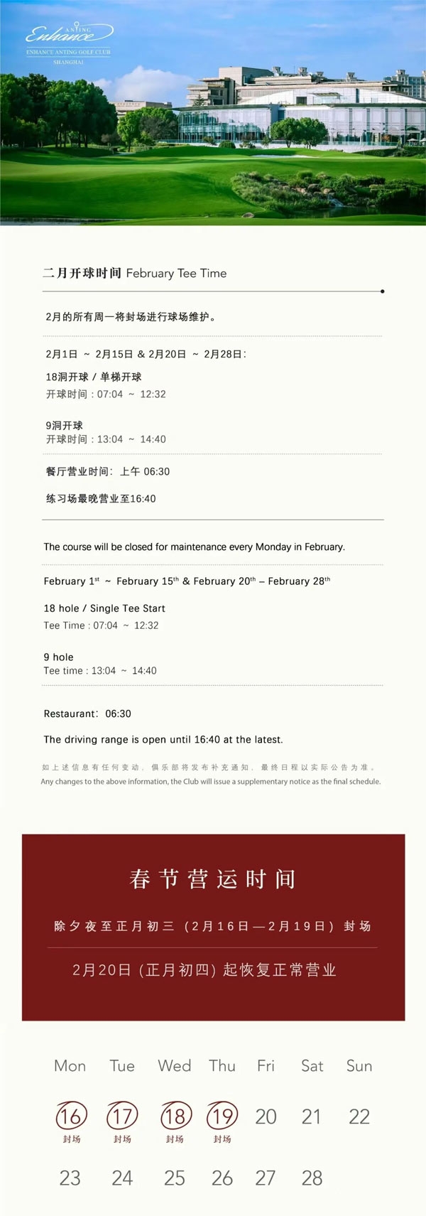 敬请留意颖奕安亭高尔夫俱乐部2月开球时间以及春节营运时间。