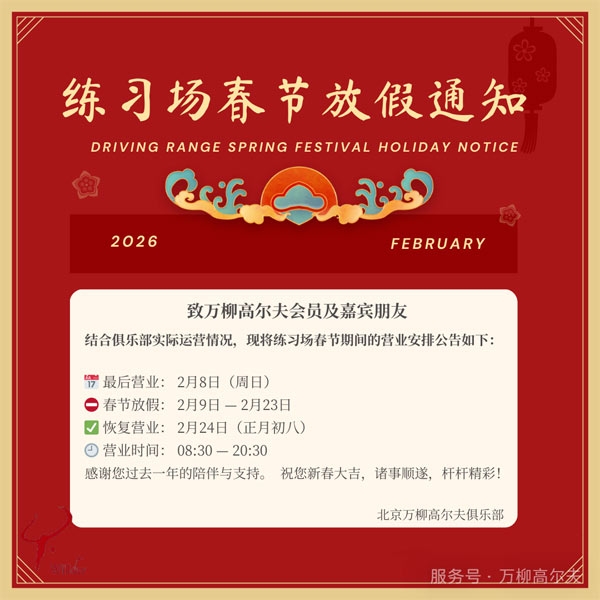 摘要:万柳高尔夫|关于练习场2026年春节放假安排的通知尊敬的会员及嘉宾朋友们:骏马奔腾辞旧岁,瑞气盈门启新程。值此新春佳节来临之际,现将万柳练习场2026年春节期间放假时间公告如下:日期时间营业安排2月08日周日正常营业2月09日至2月23日春节假期春节假期2月24日正月初八08:30—20:30温馨提...