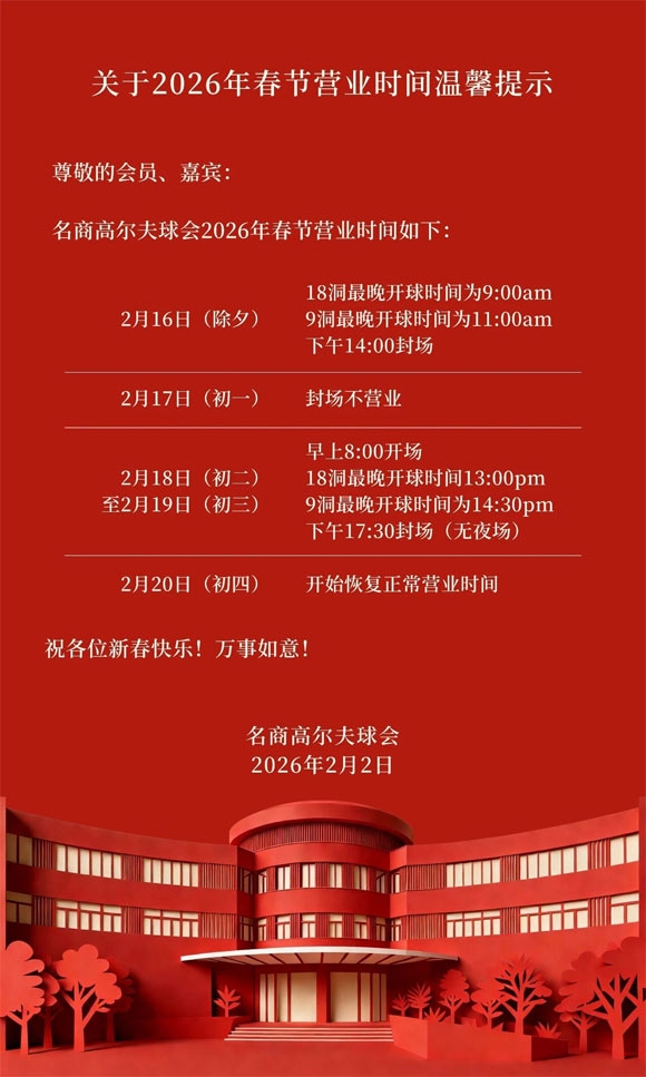 摘要:温馨提示|名商高尔夫球会2026年春节营业时间安排: