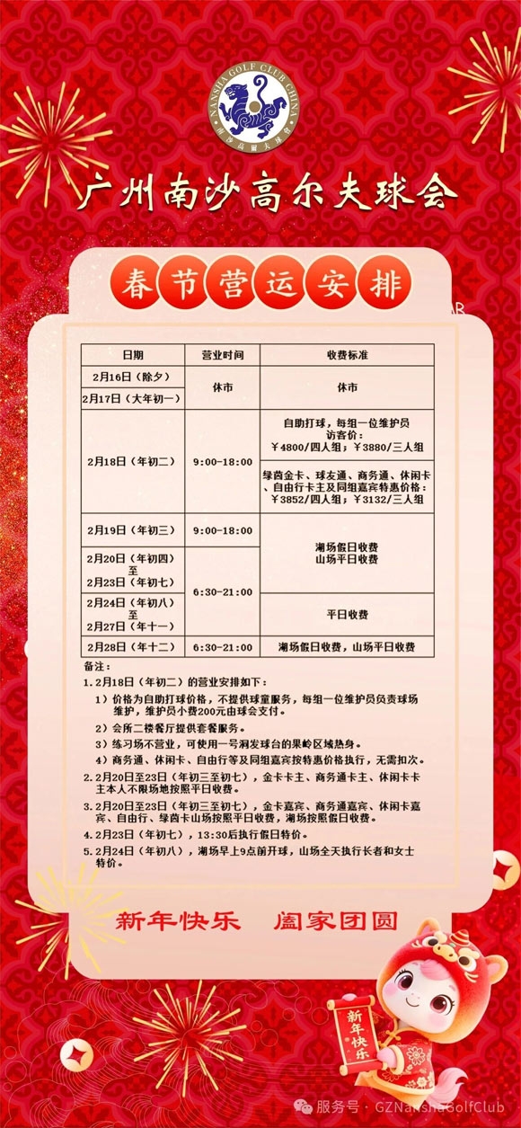 摘要:广州南沙高尔夫球会春节营业安排!预约热线:020-84681888