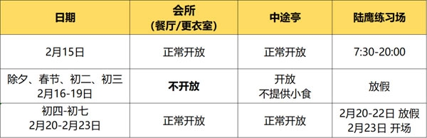 2026年上邦球会春节假日(2月15日-23日)期间运营安排及收费标准公告如下: