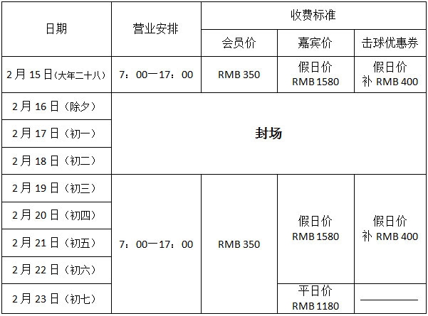 摘要:尊敬的球友:新年好!时光流转,旧岁将辞,我们即将迎来崭新的马年。衷心感谢您一直以来对球会的支持与厚爱,横店禹山高尔夫球会将于2月16日(除夕)、17日(初一)、18日(初二)封场放假三天,其他时间正常营业。期待在新的一年里,继续与您相约绿茵,共畅挥杆之悦。营业安排备注:因部分球童回家过年,为确保在春...