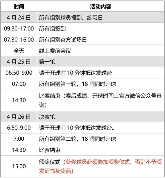 4月25-26每天1盒免费练习球(当天使用有效,超出则按20元/盒收费),参赛选手在练习场报名字即可享受(以参赛名单为准),练习果岭免费使用。