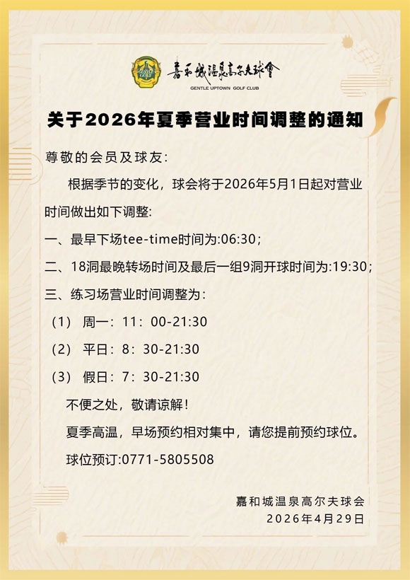 摘要:嘉和城温泉高尔夫球会关于2026年夏季营业时间调整的通知!