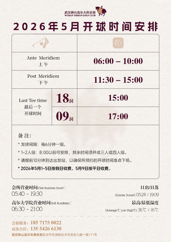 摘要:夏意初临,五月正是春深与初夏交接得最舒服的时候。阳光更透亮,球道也愈发青翠饱满,温度恰到好处,每一次挥杆都带着自然的通透与舒畅。与其让初夏的微风在窗外白白流走,不如给自己安排一场从容的开球——驿山的球道已经准备好了,期待你来。2026年5月开球时间安排来场温馨提示欢迎您和球友们到驿山球场挥杆!击球旺...